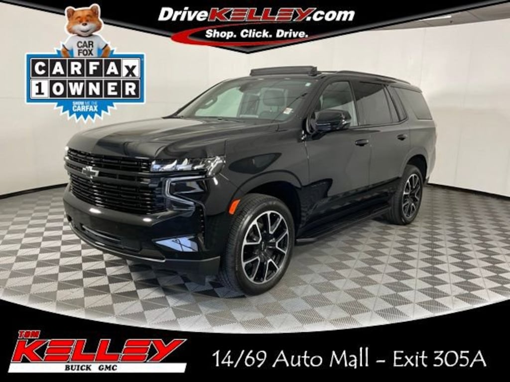 Style, space, and serious capability this 2023 Chevy Tahoe RST delivers it all. With its bold, sporty design, powerful 5.3L V8 engine, and premium upgrades including the Luxury Package and panoramic sunroof, this full-size SUV is built to turn heads and take on any road.Whether you're loading up the family, towing a trailer, or cruising in comfort, this Tahoe offers a perfect blend of performance, technology, and upscale refinement.Vehicle Overview:CarFax One OnwerYear/Make/Model: 2023 Chevrolet Tahoe RSTDrivetrain: 4WD ready for any road or weatherEngine: 5.3L EcoTec3 V8 (355 hp / 383 lb-ft torque)Transmission: 10-speed automatic15 / 20 City & Hywy MPGInterior: Jet Black with Victory Red stitching (RST trim exclusive)Premium Features & Options:Luxury Package Includes:Heated & ventilated front seatsHeated second-row outboard seatsHeated steering wheelPower tilt/telescoping steering columnPower-folding second and third-row seatsMemory settings for driverâs seat, mirrors & steering wheelEnhanced safety features (listed below)Panoramic Power Sunroof Spans across both rows for a stunning open-air feelRST Appearance Package Blacked-out trim, unique grille, RST badging, and 22 black wheels for a bold, aggressive lookChevrolet Infotainment System with 10.2 touchscreenWireless Apple CarPlay & Android AutoNavigationBose® premium 9-speaker audio systemAdvanced Safety Features (part of Luxury Package):Lane Keep Assist with Lane Departure WarningForward Collision Alert & Automatic Emergency BrakingFront & Rear Park AssistBlind Spot Monitoring with Rear Cross Traffic AlertHD Surround Vision CameraAt Kelley Automotive, every pre-owned vehicle is professionally treated with Forever New PaintGuard for only $399. This advanced protective coating creates a durable, invisible barrier that shields your vehicle's paint from UV damage, bird droppings, and environmental contaminants, helping preserve that like-new finish. Looking for complete protection? Upgrade to the Forever New Total Protection Package for just $999, which includes: PaintGuard, SoundGuard, RustGuard, LeatherGuard, FiberGuard.When you purchase a vehicle at Kelley Automotive, you'll also receive free car washes for life at any of our three convenient locations, making it easy to keep your vehicle clean and cared for year-round!Need repairs? We've got you covered. Kelley Automotive operates four professional Body Shop locations offering expert collision repair and high-quality service to keep your vehicle looking and driving its best. Experience unmatched protection, maintenance, and service all in one place. Contact your Kelley Automotive representative today to learn more about why we're your one-stop shop for all things automotive.
